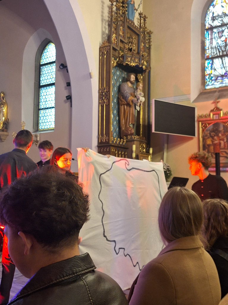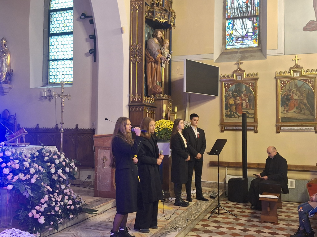 Po Mszy młodzież przedstawiła montaż słowno-muzyczny pokazujący dramat rozbiorów i trud walki o niepodległość. Na koniec umiłowaną Ojczyznę oraz naszą wolność powierzyliśmy opiece Bożej w śpiewie „Boże coś Polskę….”